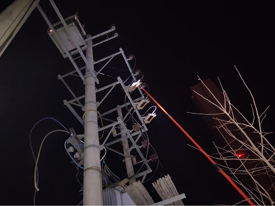 到達(dá)現(xiàn)場后,馬工邊聽現(xiàn)場電工說明情況,邊勘察現(xiàn)場,對柱上變壓器的跌落保險進行檢查,確認(rèn)安裝位置。